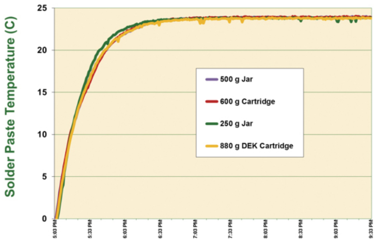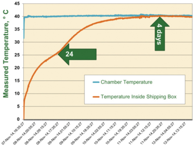 These conditions require extensive measures to ensure the carefully developed and manufactured solder paste arrives at the customer’s site with the least amount of shipping-induced variability. FIGURE 1 shows the internal temperature of a shipping container, designed to mitigate external temperature extremes, when placed in a thermal chamber for five days at 104⁰F (40⁰C).