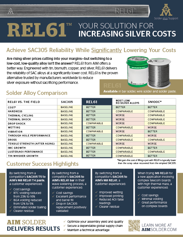 Lower your costs without sacrificing performance. Our REL61 solution sheet details how this tin-bismuth-silver alloy delivers better through-hole performance and less dross than SAC305.